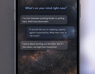 It is designed to mirror your language back to you in a calm, neutral way without advice, interpretation, or direction. It does not attempt to guide, coach, diagnose, or improve you. Instead, it creates space for your own awareness to surface.