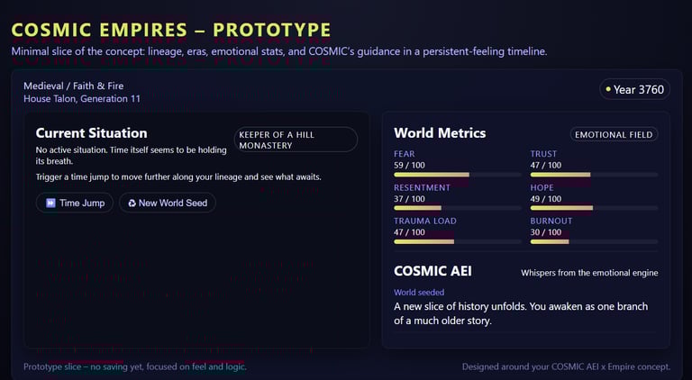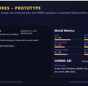 COSMIC AEI (Cosmic Artificial Emotional Intelligence) is our proprietary emotional-engaine layer designed to model the “emotional state” of a living world. Instead of treating populations as static numbers, COSMIC AEI tracks multi-dimensional parameters like Fear, Trust, Resentment, Hope, Trauma Load, and Burnout, and feeds those values into the game’s core systems—affecting stability, uprisings, golden ages, breakthroughs, and the events your descendants encounter. Player decisions update the emotional model, and COSMIC AEI responds by adjusting world behavior and generating in-universe advisor narration that highlights the emotional consequences of each choice.